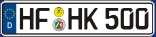Hier ist das heutige normale Europa-Standardkennzeichen zu sehen. Als Vorreiter war Irland 1991 das erste europäische Land, daß dieses neu gestaltete Kennzeichen eingesetzt hat. Im Zuge der europäischen Harmonisierung und politischen Veränderungen führte Deutschland die Kennzeichen mit Euro-Feld zum 01.01.1994 zunächst in Berlin und Brandenburg und ab Juli auch in Sachsen auf freiwilliger Basis ein. Die Besonderheit der Euro-Kennzeichen im ersten Jahr war der Bindestrich zwischen Orts- und Trennungskennzahl. Nach Einführung in den restlichen Bundesländern am 1.1.1995 entfiel dieser. Der Trennstrich mußte weichen, weil das Bundesverkehrsministerium statt dessen lieber die Wappen der jeweiligen Bundesländer auf den Schildern plazieren wollte, die im Gegensatz zu den herkömmlichen Stempelplaketten nicht 35 mm im Durchmesser betrugen sondern 10 mm mehr. Die neuen Länderwappen gab es allerdings erst ab dem 1. Juli 1995. Bis dahin wurden 6 Monate lang die Euro-Kennzeichen ohne Trennstrich und mit den herkömmlichen Zulassungsplaketten ohne Landeswappen (Durchmesser 35mm) ausgegeben. Durch das blaue Euro-Feld wurde eine schmalere Schrift notwendig. Mit dem Euro-Kennzeichen feierte somit auch eine völlig neu entwickelte Schriftart ihre Premiere. Die sogenannte FE-Schrift (FE = "fälschungserschwerend") kam zu Ihrer Geburtsstunde. Die Entwicklung der FE-Schrift war bereits im Vorfeld schon lange abgeschlossen. Sie stammt aus der Zeit der Terroranschläge der 70er Jahre von RAF-Aktivisten. Man versuchte durch das ungewöhnlich neue Erscheinungsbild der FE-Schrift eine Erschwerung der Fälschung und eine Verwechslung der Buchstaben und Zahlen untereinander auszuschließen. Standardmäßig wird die FE-Mittelschrift (Buchstabengröße: 47,5 x 75mm, Zahlengröße: 44,5 x 75mm) für die Prägung von Kfz-Kennzeichen benutzt, sofern die Buchstaben-Zahlen-Kombination in Summe nicht mehr als sieben Einheiten ergeben. Das gesetzlich maximale Ausmaß für einzeilige Euro-Kennzeichen beträgt 520 x 110mm. Die FE-Engschrift darf eingesetzt werden, wenn die Buchstaben-Zahlen-Kombinationen acht Einheiten ergeben. Die zu benutzende Schriftgröße ist vorgeschrieben bzw. ergibt sich aus der Buchstaben-Zahlen-Kombination. Zur Herstellung kürzerer Kennzeichen als das gesetzlich vorgeschriebene Größtmaß darf die verkleinerte FE-Engschrift nur dann verwendet werden, wenn dies bauartbedingt durch eine Kfz.-Prüfstelle in Kfz.-Papieren abgenommen und eingetragen ist (Sondergutachten).Die Schriftgröße beträgt bei der FE-Engschrift: Buchstaben 40,5 x 75mm und Zahlen 38,5 x 75mm.